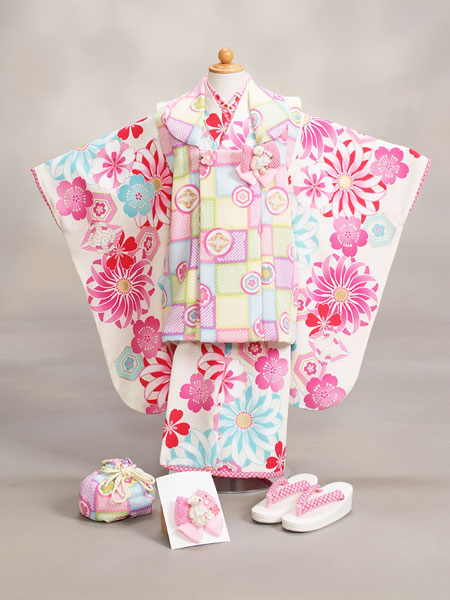 【3-39】三歳女の子被布セット【白×多色/花】【ジャパンスタイル×つるの剛士】【七五三着物レンタル】