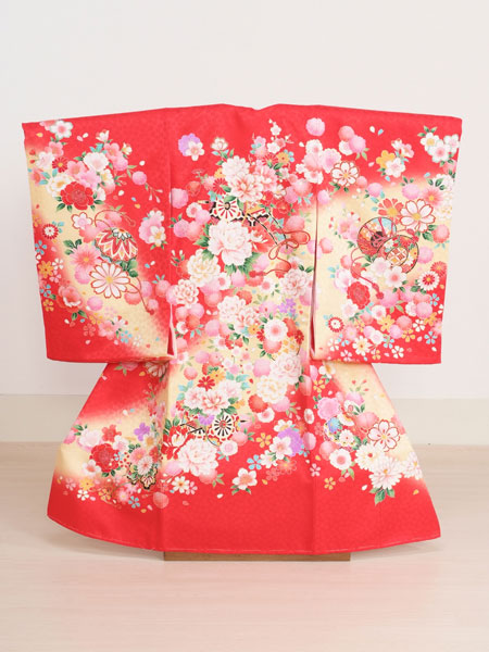 女の子らしい赤ののしめです。柄はお花がたくさん散りばめられており、華やかな日にぴったりのお衣装です。