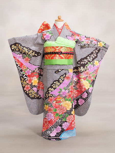 こちらの商品は、着物が黒地で花柄と熨斗の柄が入った豪華な着物です。色の発色が紅型のような感じで豪華な雰囲気を出してくれます。