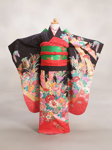 七歳女の子お祝着セット【7-15】【黒/しぼり・熨斗・花】の七五三レンタル衣裳をご紹介させて頂きます。