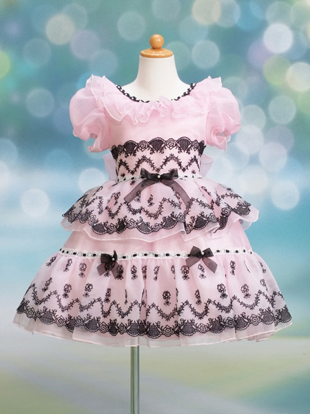 こちらの商品は、ピンク地に黒の刺繍がオシャレになっていて少し大人びたドレスになっています。ウエストリボンで多少のサイズ調節が可能です。