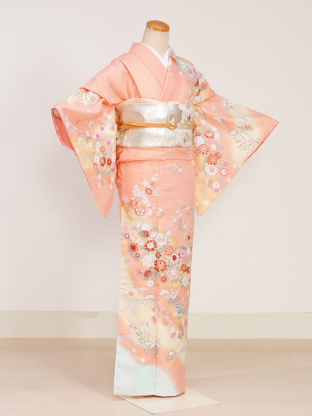 こちらの商品は、「HL(アッシュエル)」というブランド衣裳の着物になっています。サーモンピンク地に花柄が入っている訪問着になっています。お若い方、初めて着物をお召しになる方にはオススメの衣裳になっています。