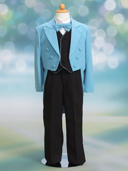 こちらの商品は、ブルーの上着に黒のズボンのタキシードです。鮮やかなブールーがかわいらしさを引き出しています。