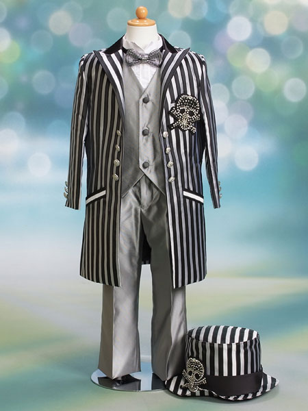 こちらの商品は、黒とグレーのストライプの上着とグレーのベストとズボンになっているタキシードです。胸のどくろがオシャレ感を出しています。かっこいい感覚のタキシードです。