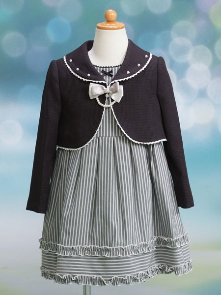 ストライプ柄のノースリーブワンピースにリボンと飾りがキュートなボレロがセットになっています。発表会や入学式にオススメです。 「MICHIKO LONDON」のブランドです。