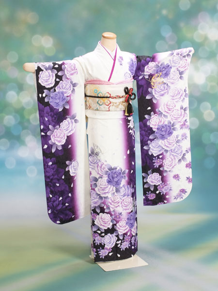 こちらの振袖は白地に紫から黒のグラデーションが素敵です。柄もバラとポイントで入ってる蝶がオシャレです。