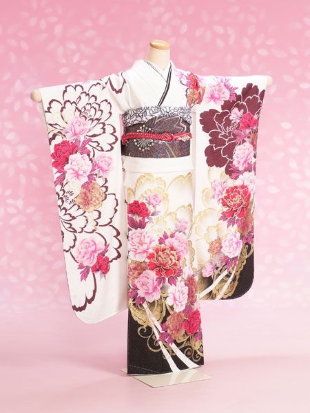 こちらの商品は白地に大きなバラ印象的なお振袖です。また裾などに黒のグラデーションが入っていて、少しかっこいい雰囲気のお振袖です。