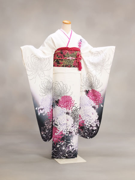 こちらの商品は、白地に黒のぼかしと柄は鮮やかな菊で、かっこいい印象の振袖です。個性を出したい方におススメです!!