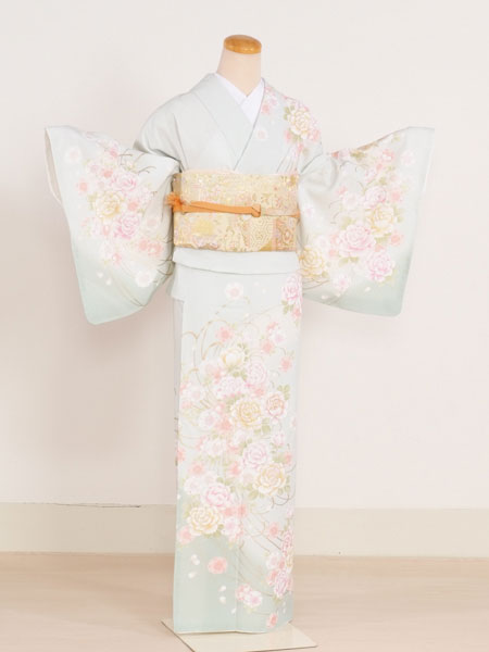 こちらの商品は、薄グリーン地にバラと乱菊の柄が入っている上品な訪問着です。地色が明るい色ですのでお若い方にはお似合いになる着物です。