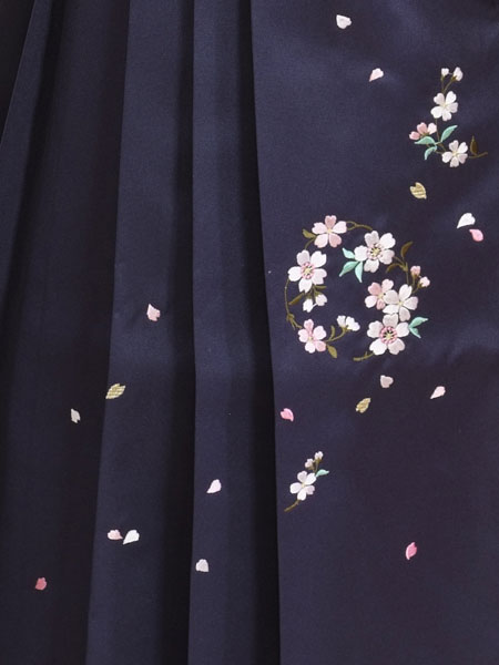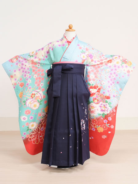 着物がブルーグリーン地になっています。(写真で見ると水色系に見えますが、水色とはちょっと違った感じになっています。)左側と右側で微妙に色が変わっています。向かって左側は少しグリーンがかっていて、右側は水色に近い色になっています。着物には、花と鞠の柄が入っています。ちょっと変わった色目を着たいという方にはオススメです。 袴は紺に小さな桜の刺繍が沢山入っています。