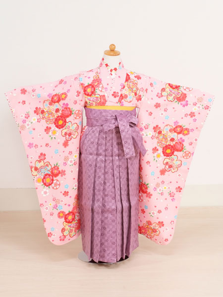 ピンク地に色とりどりの花柄が可愛らしいお着物に大人っぽい薄紫色の袴のセットです。 袴は市松柄に小さな桜が沢山入っています。