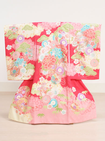 お宮参り・初着レンタル 女の子用【O-15】【赤・ピンク/うさぎ・松竹梅・鞠】【乙葉】